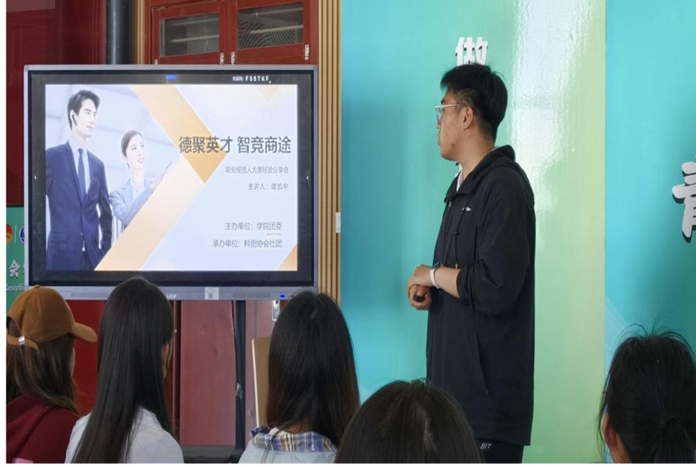 本次分享会特别邀请到在德州市职业经理人大赛中荣获创业精英赛三等奖的谭凯中,在大赛的磨砺中,谭凯中积累了丰富且宝贵的经验,对大赛流程、备赛策略以及参赛实战有着极为深刻的见解。分享会上,谭凯中详细解读大赛的每一个环节。从前期准备阶段的资料搜集、策略制定,到现场应对时的随机应变、沉稳发挥,再到团队协作中的分工配合、沟通协调,让大家对职业经理人大赛有了更为透彻、全面的认识。分享会的最后,谭凯中表达了对同学们的殷切期望,鼓励大家以积极乐观的心态,带着在此次分享会中收获的知识与勇气,勇敢地踏上属于自己的职业新征程。