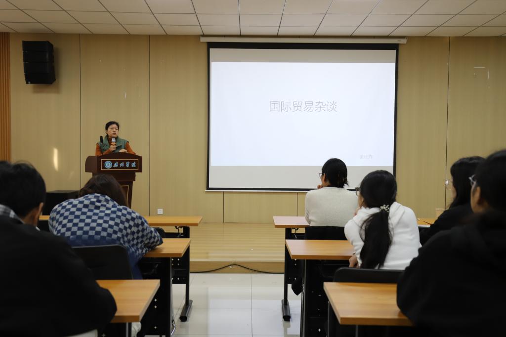 首先,金主任围绕当前大学生就业形势及特点,指出如今大学生就业中考公考编机会少、就业竞争激烈、企业招聘要求高等突出问题,并围绕公司的发展历程、招聘岗位及要求、薪资福利等进行介绍。随后,翟经理从国际贸易宏观分析、国际贸易模式以及国际贸易从业者需要做什么等几个方面分享了自己对国际贸易相关内容的理解,强调大学期间要持续提高自己学习的能力。通过翟经理的指导,学生们对国际经济与贸易的内容有了更加深刻的理解。最后,人人爱人人爽教师发表了自己的感言并鼓励同学们要积极参与到就业创业活动之中。