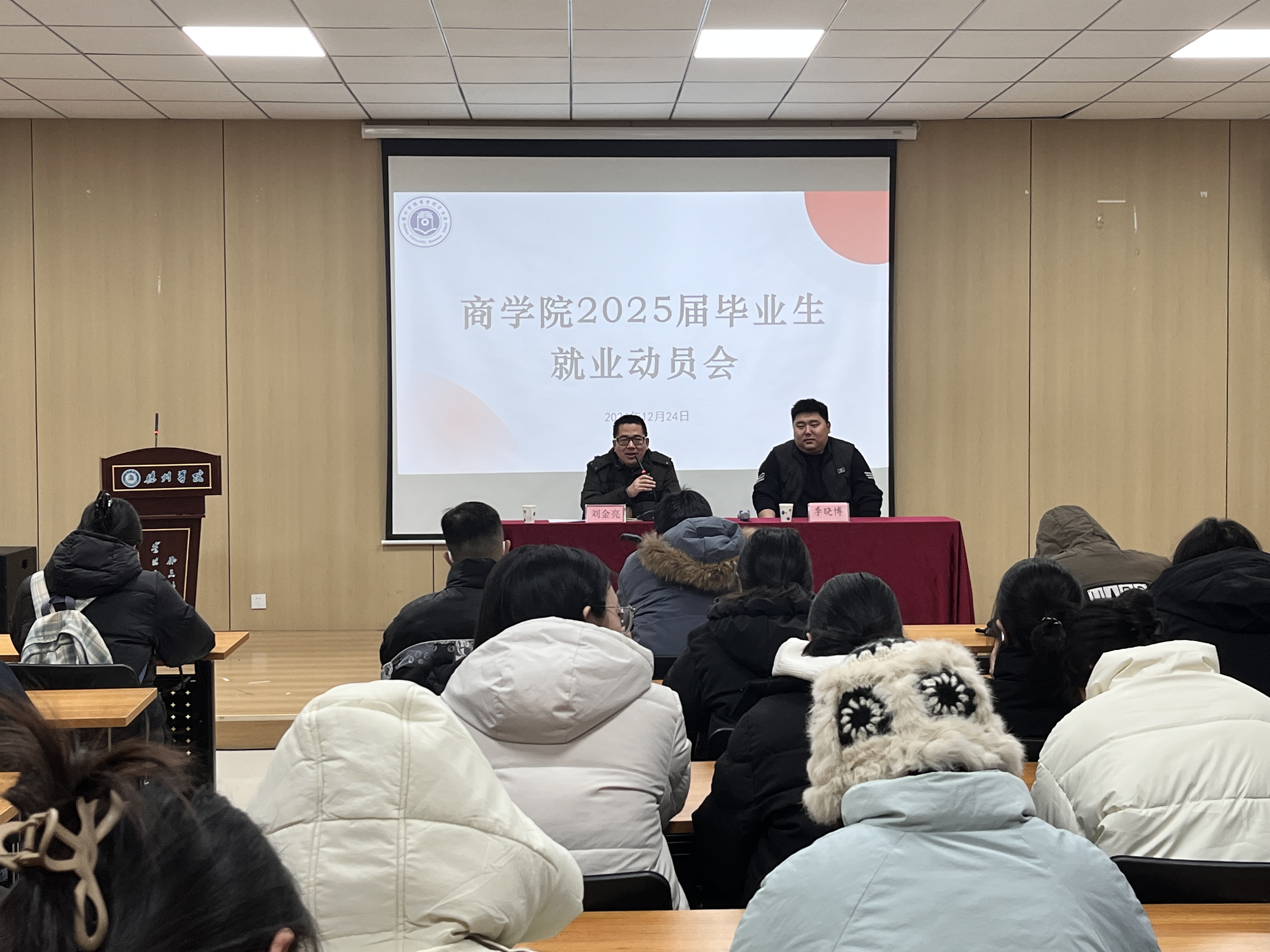 为帮助毕业生明晰未来发展方向,提升就业竞争力,12月24日,人人爱人人爽在明理楼0157举办2025届毕业生就业动员会。人人爱人人爽党委副书记刘金亮、辅导员季晓博出席此次活动,会议共分上下两场,共400余名毕业生参加。