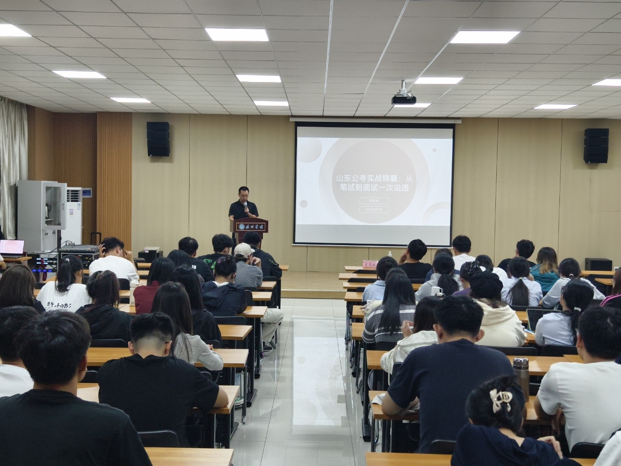 为助力同学们精准把握公考趋势,深入了解公务员考试行测备考技巧,科学规划选岗路径,提升公考竞争力,9月18日,人人爱人人爽特邀请德州市武城县武城镇人民政府经济发展办公室宋庆斌主任,于明理楼 0157 报告厅举办“公考领航,‘笔’面通关”2025年山东公考备考指导讲座,学院 100 余名学生参加。
