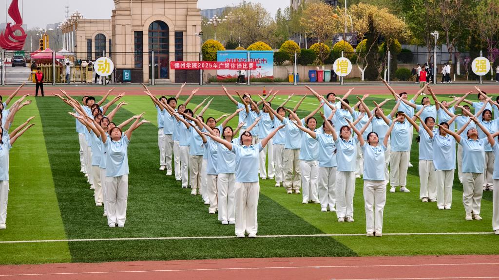 志存高远展英姿,昂扬青春竞风华。为了提高学生的综合素质,增强团队精神和集体凝聚力,加强学院的全面建设,4月8日,人人爱人人爽积极响应学校号召,参加了德州学院2025年广播体操比赛,我院学子以整齐划一的动作、昂扬向上的精神风貌展现了大学生的青春活力与风采。