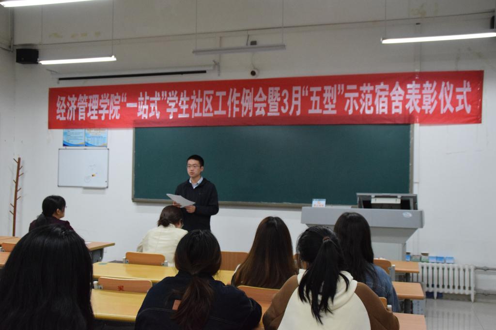 为推进“一站式”学生社区建设,营造整洁、文明、舒适、优美的宿舍氛围,经济管理学院计划开展“五型”示范宿舍月月评活动。4月20日,学院于明理楼0366教室召开“一站式”学生社区工作例会暨3月“五型”示范宿舍表彰仪式。
