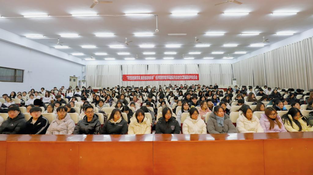 为进一步端正学风,严肃考风,营造好学、乐学的学习氛围。12月21日,经济管理学院在求实楼0409报告厅开展了“学思践悟树学风,踔厉奋发向未来”学风建设月启动仪式暨诚信应考动员会。学院领导班子,全体辅导员、班主任老师,各年级学生代表共350余人参加活动,本次活动同时设线上分会场。
