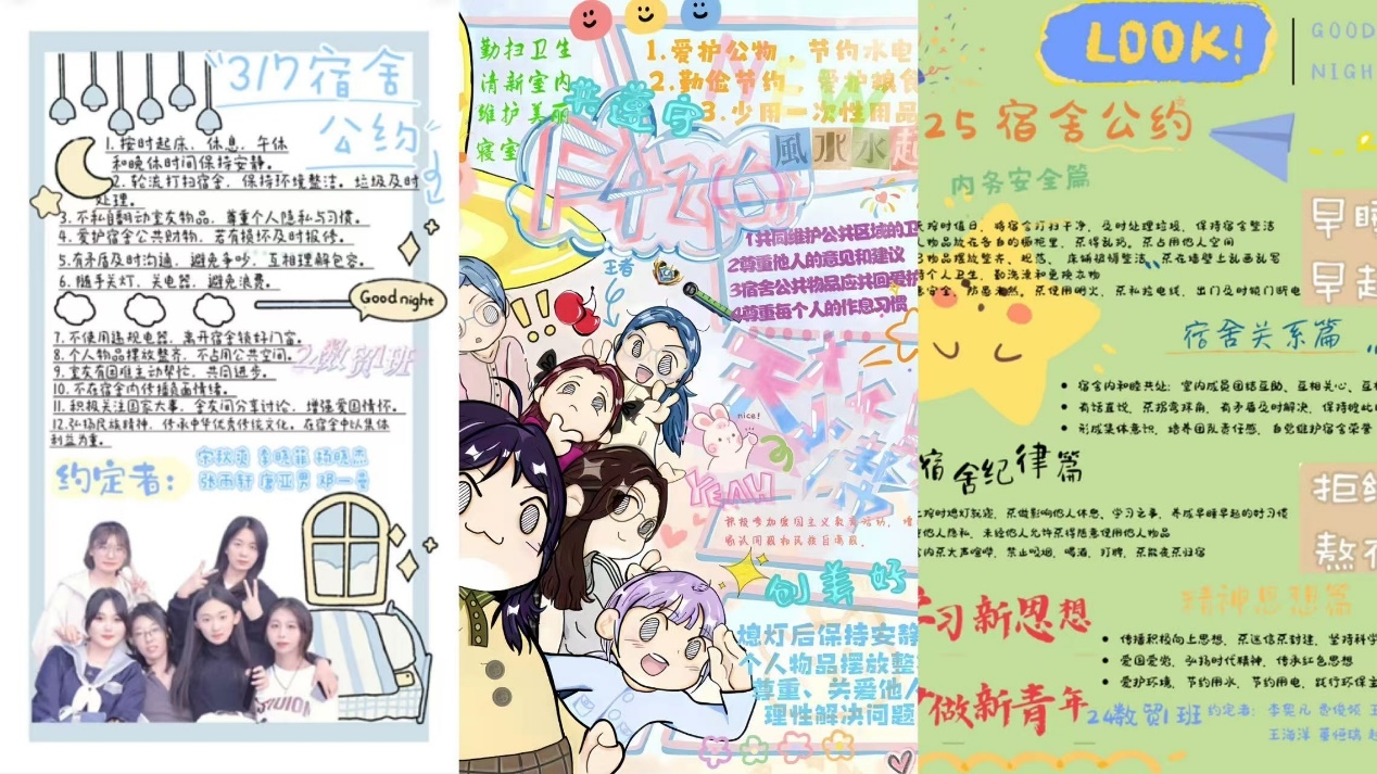 本次大赛主要以电子海报、电子手抄报和手写手抄报的形式展开,要求公约内容条理清晰、积极向上,并适当融入思政元素,展现爱国主义情怀。同时,学生社区服务中心本着公平原则对各宿舍的参赛作品进行评选,评选出一等奖、二等奖、三等奖及优秀奖若干并给予奖励。比赛过程中,各宿舍本着“用规则营造温馨氛围,用公约构建和谐宿舍”的宗旨,融合多元元素,以多样的形式围绕生活作息制度、卫生文明制度、宿舍安全制度、和谐相处法则等方面设计宿舍公约。同学们积极参与,充分发挥创意,从公约外观到公约内容都新颖独特,展现出同学们对宿舍卫生的重视以及宿舍成员之间的团结与温暖。