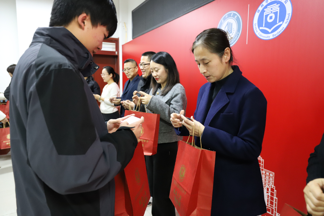 最后,学院领导班子和毕业班主任赠送“研”途送温暖考研大礼包。小小的礼物满载着深情厚谊,薯片寓意着“片片顺利”;旺仔牛奶以其特有的温馨,寓意着“成绩旺旺”;精心准备的涂卡笔,期望学子们“下笔如有神”;学子们写下对自己想说的一句话,亲手挂在发光树上,见证“硕”果;一张上岸车票,预祝2025届所有考研学子“成功上岸”。随后,考研学子们在卡片上写下对未来的寄语,并亲自挂上许愿树,蕴含了考研学子对未来的美好期待和祝愿。