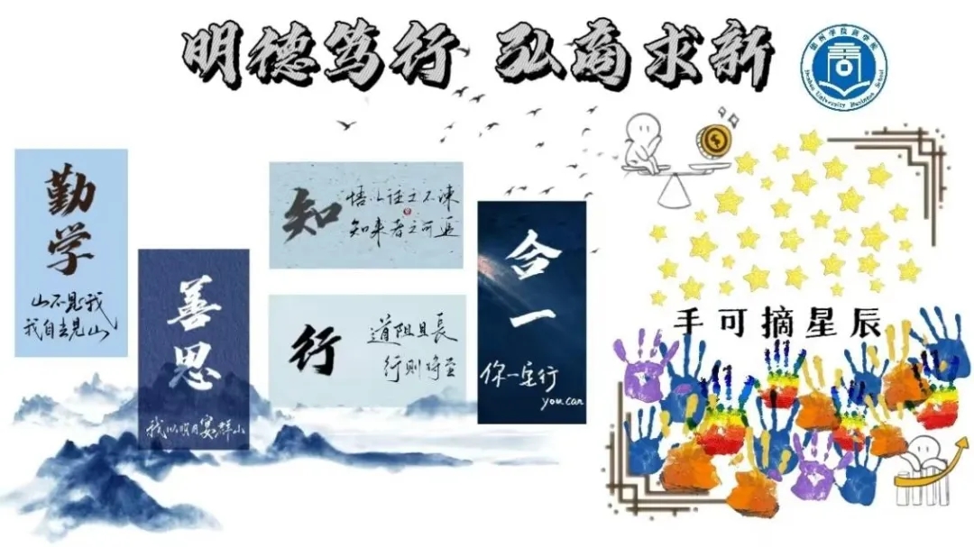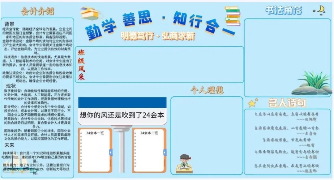 此次活动在教室统一设立学风文化墙。展示了德州学院的学风标语——“勤学善思,知行合一”并辅以其他鼓励学习、促进学风的劝诫性标语。各班级集思广益,发挥同学们的自觉主动性,从班级的学风特点、专业特点、共同目标等方面进行创意构思,形成“一班一特色”的班级学风文化墙。