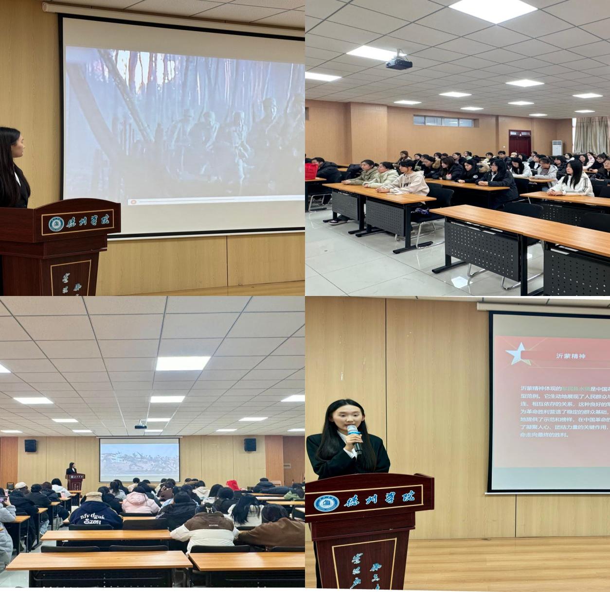 活动伊始,一则短片将众人引入那硝烟弥漫、战火纷飞的岁月,使同学们身临其境地体悟彼时民族危亡、血雨腥风的时代背景。宣讲人先从沂蒙精神的源头展开介绍。沂蒙精神源自抗日战争、解放战争时期沂蒙山地区长期的革命与建设实践沉淀升华而来。而后又就沂蒙精神的丰富内涵予以讲解,主要涵盖党群同心、军民情深、水乳交融、生死与共等。通过众多生动鲜活的革命实例和故事,诸如沂蒙六姐妹救伤员、送粮草、支援前线,沂蒙红嫂王焕于自身艰难处境下毅然收养多名八路军战士遗孤等,形象地彰显了沂蒙相亲与人民军队紧密相连、相互依存的血肉关系,彰显了这种关系在中国革命进程中发挥的凝聚人心、团结力量的关键作用,让大家深切领悟了“党群同心,军民情深,水乳交融,生死与共”的沂蒙精神真谛,感受那在战火纷飞中孕育而出的伟大力量。